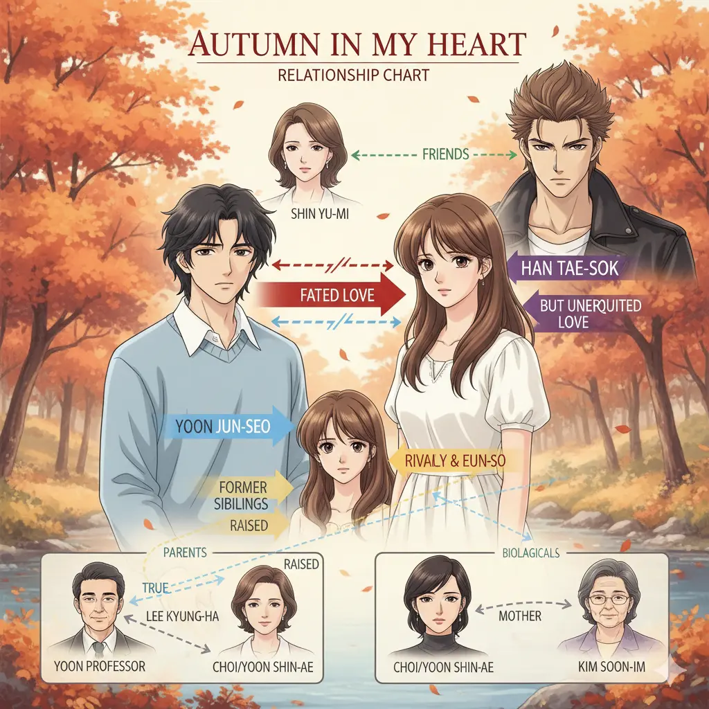 『秋の童話』の物語は、主人公たちだけでなく、彼らを取り巻く人々の関係性によって、より一層深みを増します。ここでは、物語を理解する上で欠かせない重要な関係性を解説します。