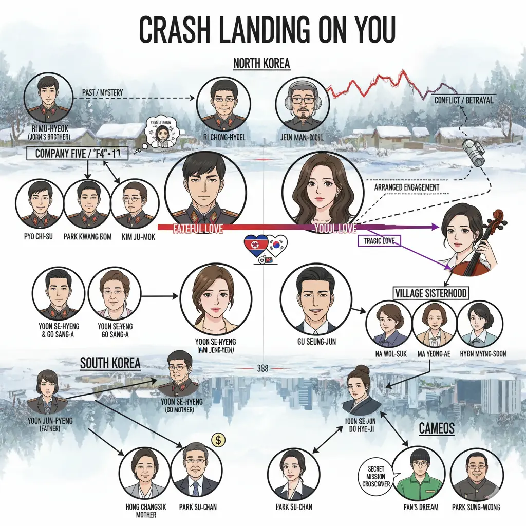 『愛の不時着』の最大の魅力は、個性豊かな登場人物たちとその関係性です。ここでは、物語の中心となる人物から脇を固める名優まで、彼らの相関図を詳しく見ていきましょう。