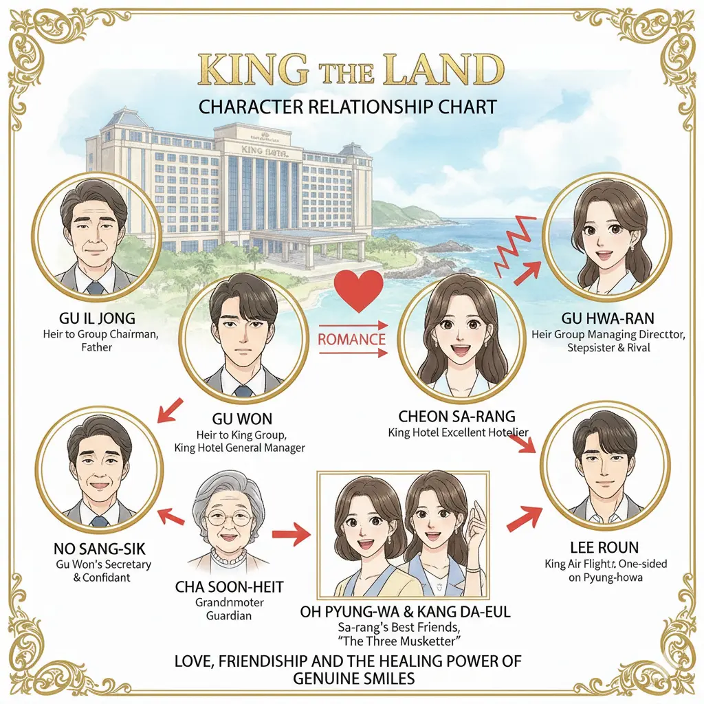 この相関図は、『キング・ザ・ランド』の主要な登場人物とその関係性を視覚的にまとめたものです。中心にいるク・ウォンとチョン・サランのロマンスを軸に、キンググループ内の後継者争い、そしてサランを支える親友たちとの固い絆が描かれているのが分かります。