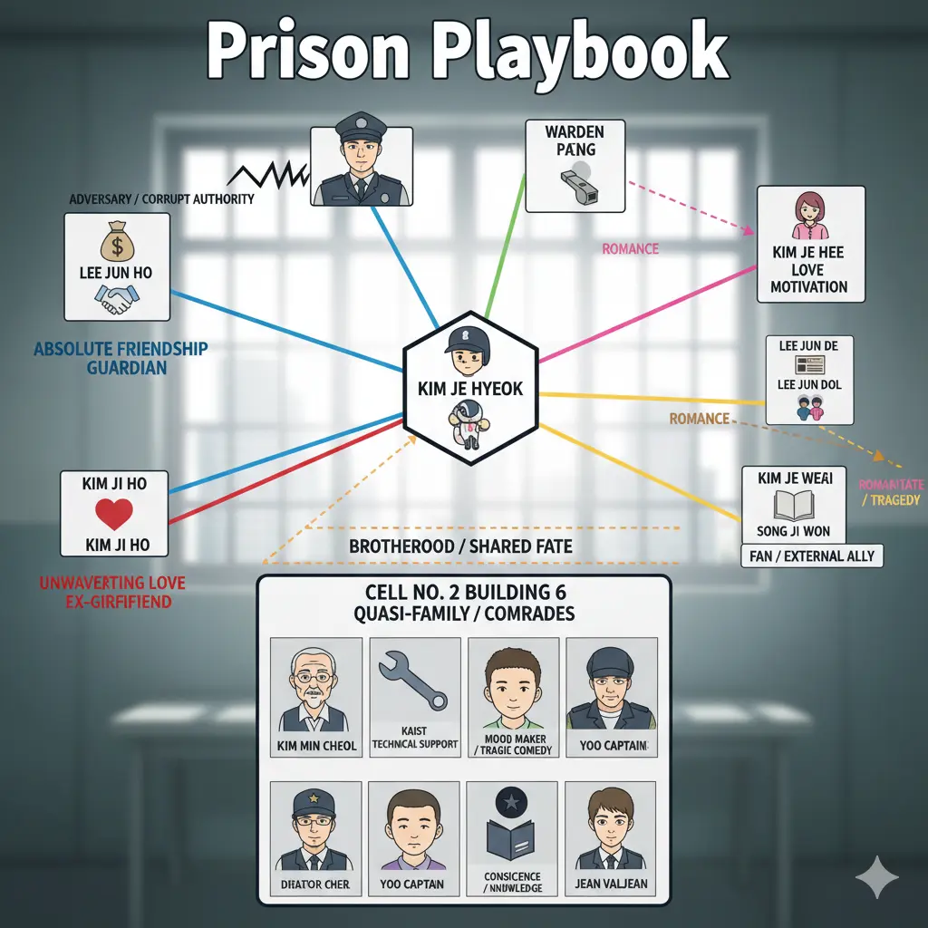 『刑務所のルールブック』の物語は、主人公キム・ジェヒョクと、彼を取り巻く人々の強固な絆によって動かされます。刑務所の内と外、二つの世界で彼を支える存在が、このドラマの核心です。